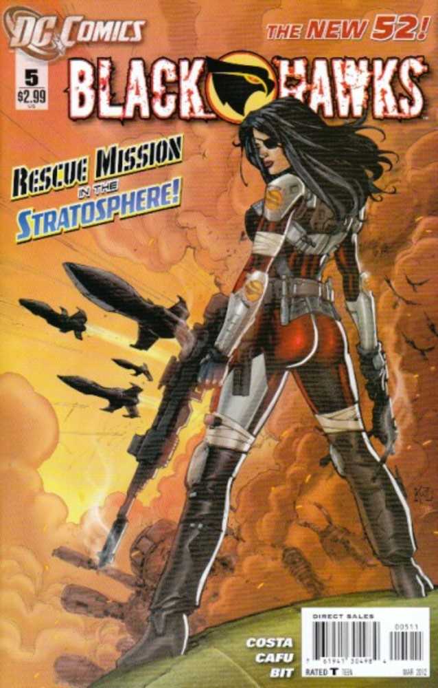 Three of the Blackhawks are incapacitated with injuries, and two more are stranded in outer space! The team has suffered a serious beating, but they still have one more crazy, hail Mary stunt up their sleeve as our first story is brought to its explosive conclusion by Mike Costa and new fan-favorite artist CAFU!